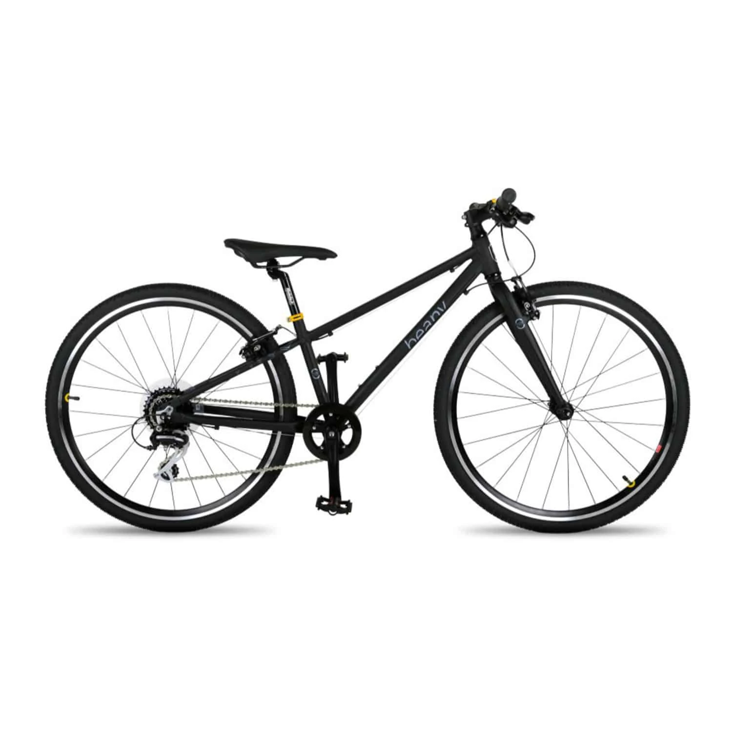 In der Größe 26″ ist das Bike mit einer leicht zu bedienenden 9-Gang Kettenschaltung ausgestattet, um dem größeren Bewegungsbereich der nun schon erfahrenen jungen Biker und Bikerinnen besser entgegen zu kommen. Außerdem setzt Beany weiter auf die Starrgabel, anstelle einer schwereren Federgabel, um Gewicht einzusparen. Die Dämpfung erfolgt damit primär über die breite Bereifung und die Rahmenkonstruktion. Mechanische Felgenbremsen bringen das Bike zuverlässig zum Stehen.