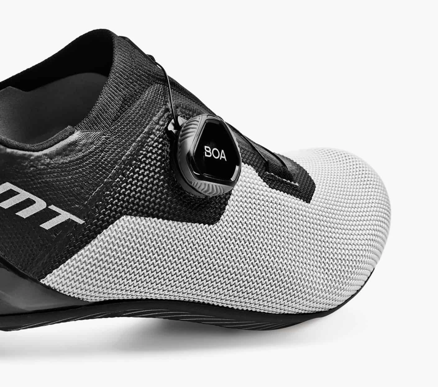 Die DMT KR4 Rennradschuhe bestechen durch ihr schlankes und schlichtes Design und eine Hybrid-Strickkonstruktion.