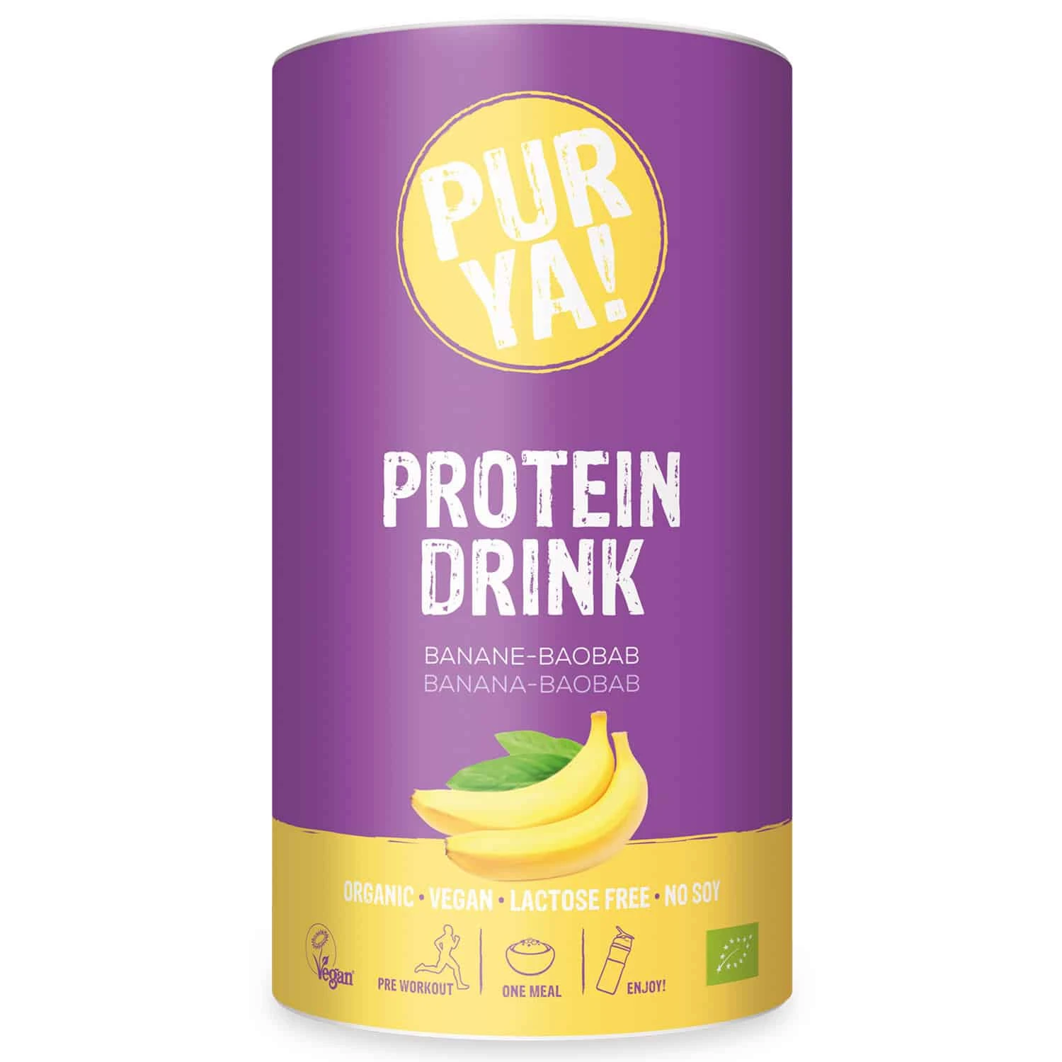 Drink Banane-Baobab von PURYA. Der 53-%-Proteinmix besteht aus